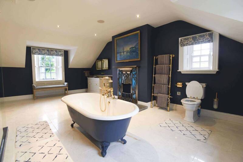 The nautical theme pays tribute to the Titanic using timbers from the Harland & Wolff shipyard and his and hers Belfast sinks overlooking The Alpine garden, beside a wonderfully upholstered window seat, perfect for supervising the chef.